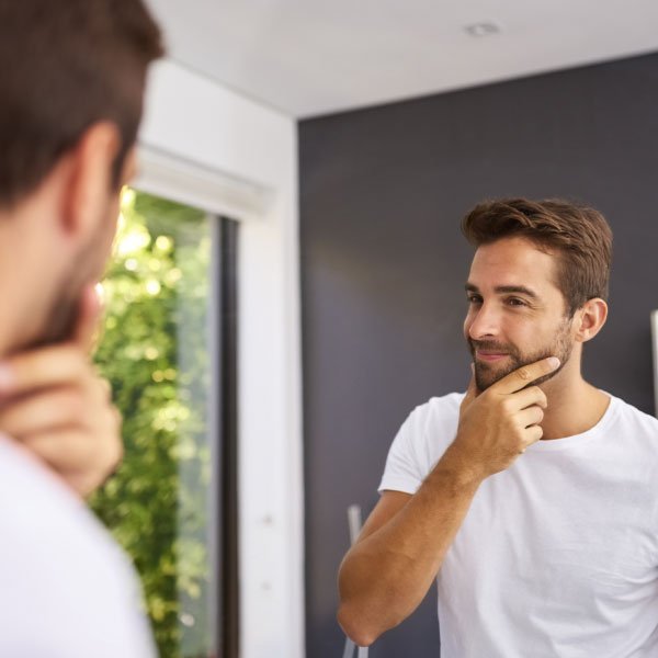 - Tome una navaja nueva, de preferencia para piel sensible, e inicie el afeitado por los costados, tapando la patilla con un dedo, para obtener un corte uniforme. Continúe con movimientos descendentes, con cuidado en áreas sensibles como el cuello y la línea de la mandíbula. Rasure el área entre la nariz y el labio al final.