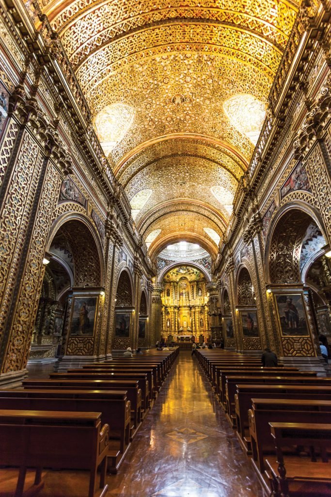 • Por la calle García Moreno llegamos a la Iglesia de la Compañía, tesoro del barroco quiteño y de Sudamérica, cuya construcción necesitó 160 años. Su interior, forrado íntegramente de pan de oro, brilla e ilumina los hermosos artesanados mozárabes, españoles y persas. Allí descansa Santa Marianita de Jesús.